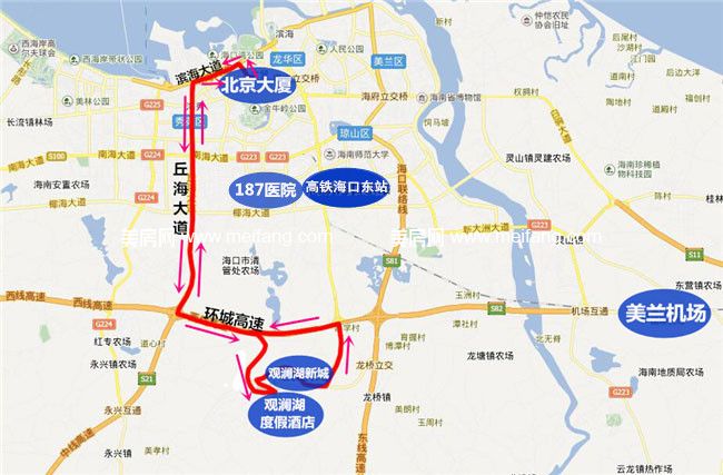 从明珠路左转进入滨海大道后转入丘海大道,上环城高速再转入观澜湖大道,到达海口观澜湖营销中心,车程36分钟(因丘海大道为货运主干道,大量货车同行,交通稍堵)。